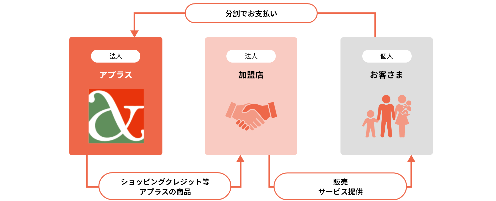 分割払いサービスによってお客さまは月々無理のない支出で商品を手に入れることができ、経済的負担を分散させることができます。加盟店は販売機会を増やし、アプラスはサービス提供を通じて利益を得る。このビジネスモデルは、消費者、加盟店、そしてアプラスの三者にメリットをもたらし、経済活動の活性化に貢献しています。