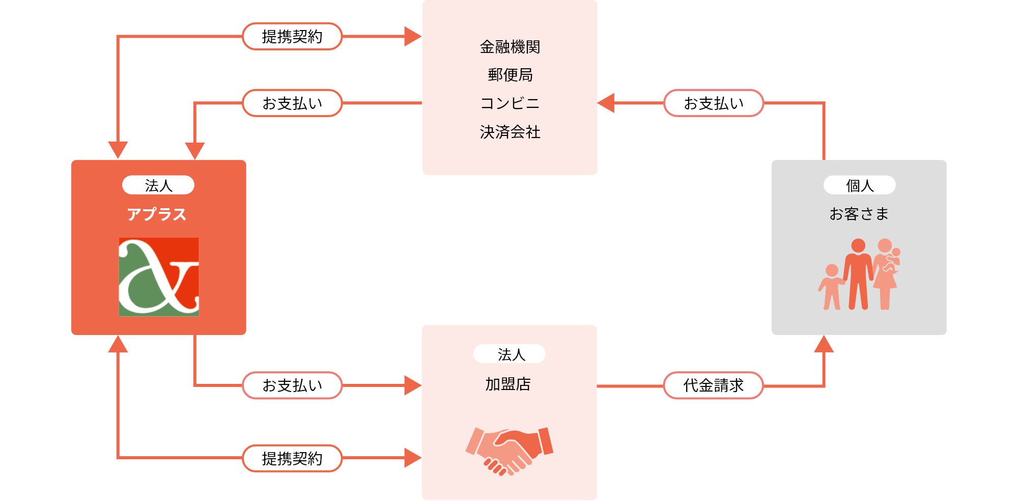 アプラスと提携した全国の取引金融機関やコンビニ、コード決済会社を通じて、お客さまからの集金を代行。加盟店と消費者の間でスムーズな決済体験を提供することで、顧客には安心と便利さを、加盟店には売上向上と効率化に貢献しています。