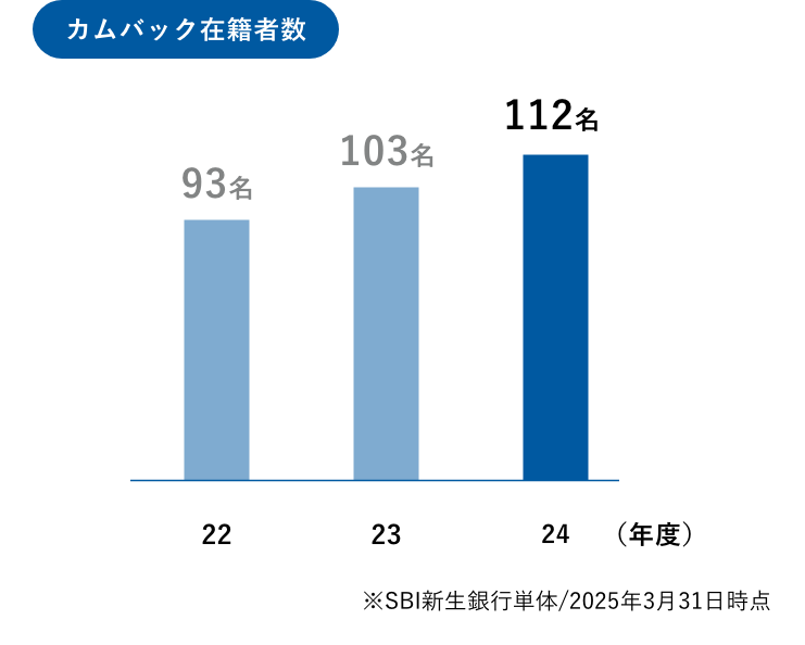 SBI新生銀行は、一度ご退職された方々を再びお迎えする「カムバック採用」を推進しています。さまざまなバックグラウンドを持った人材が、それぞれの専門性を活かして幅広い領域で活躍しており、多様な経験を持つ方々が力を発揮しやすい環境が整っています。