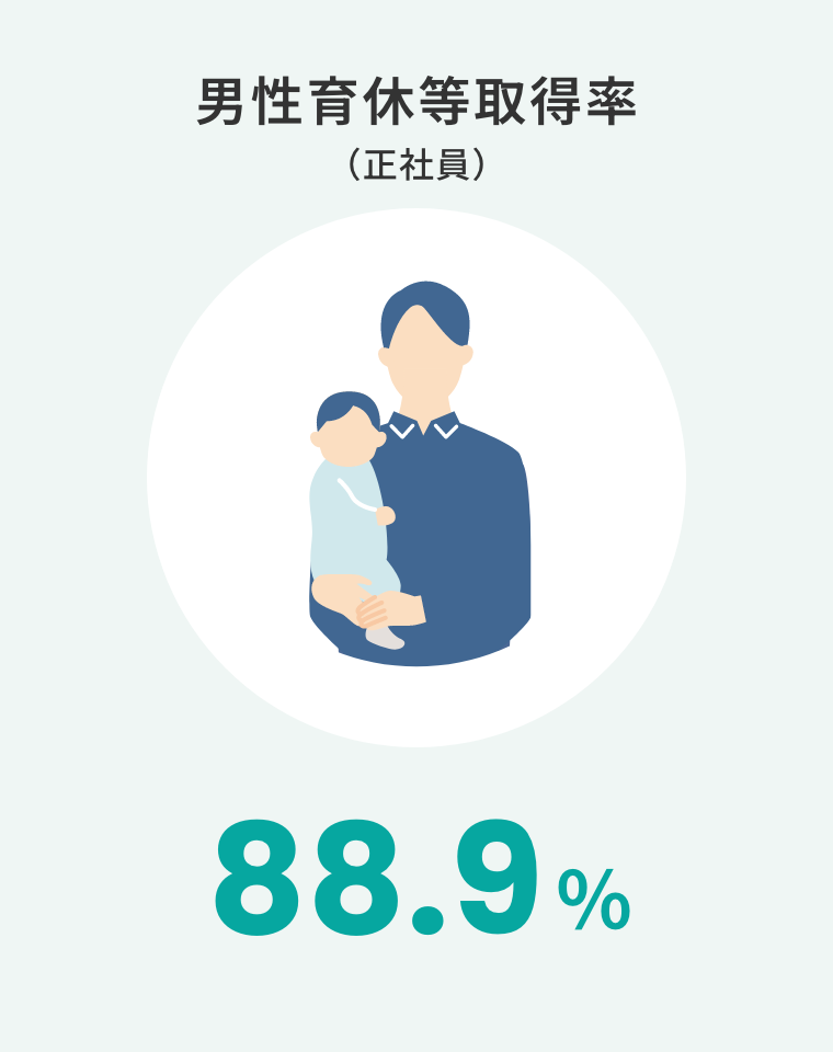 ※ 男性の育児休業等取得率については、育児休業等と育児目的休暇(「はぐくみ休暇」)の取得者数の割合を記載しております。 育児休業については、対象の子が2歳となる前日までの間の休業を当連結会計年度に開始した者の数を、育児目的休暇については、配偶者の妊娠時から子が満2歳となるまでの間に取得することができる休暇について、当連結会計年度に初めて取得した者の数を、当連結会計年度において配偶者が出産した男性労働者数で除することによって算出しているため、100%超となることがあります。